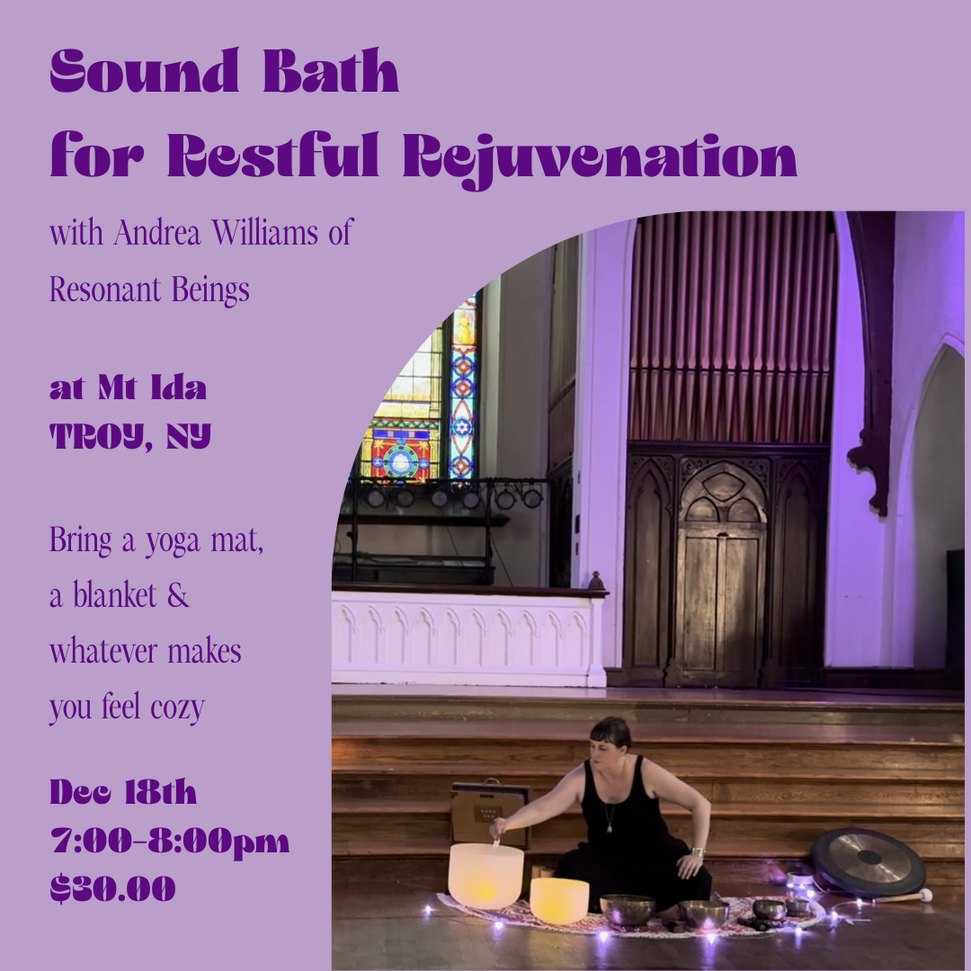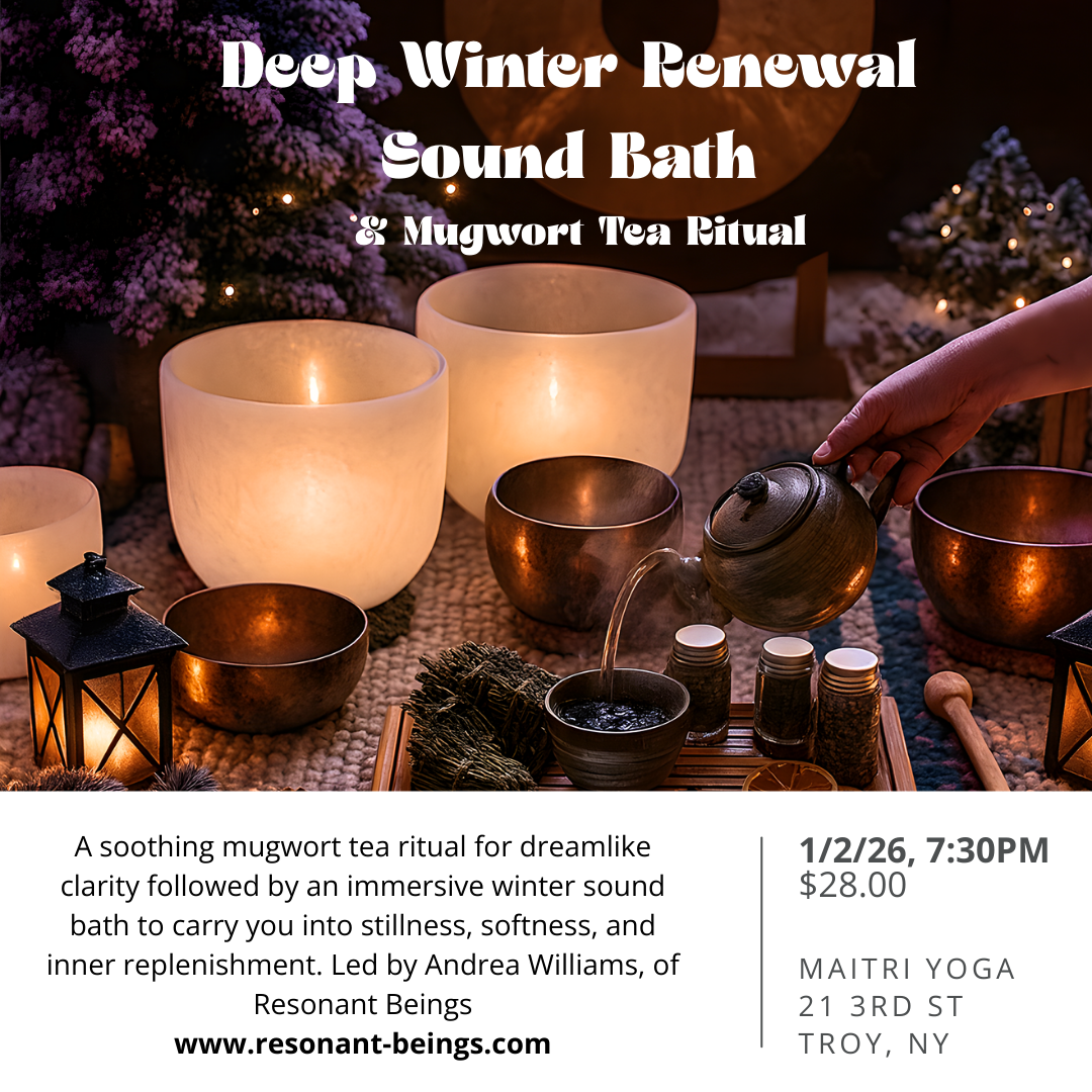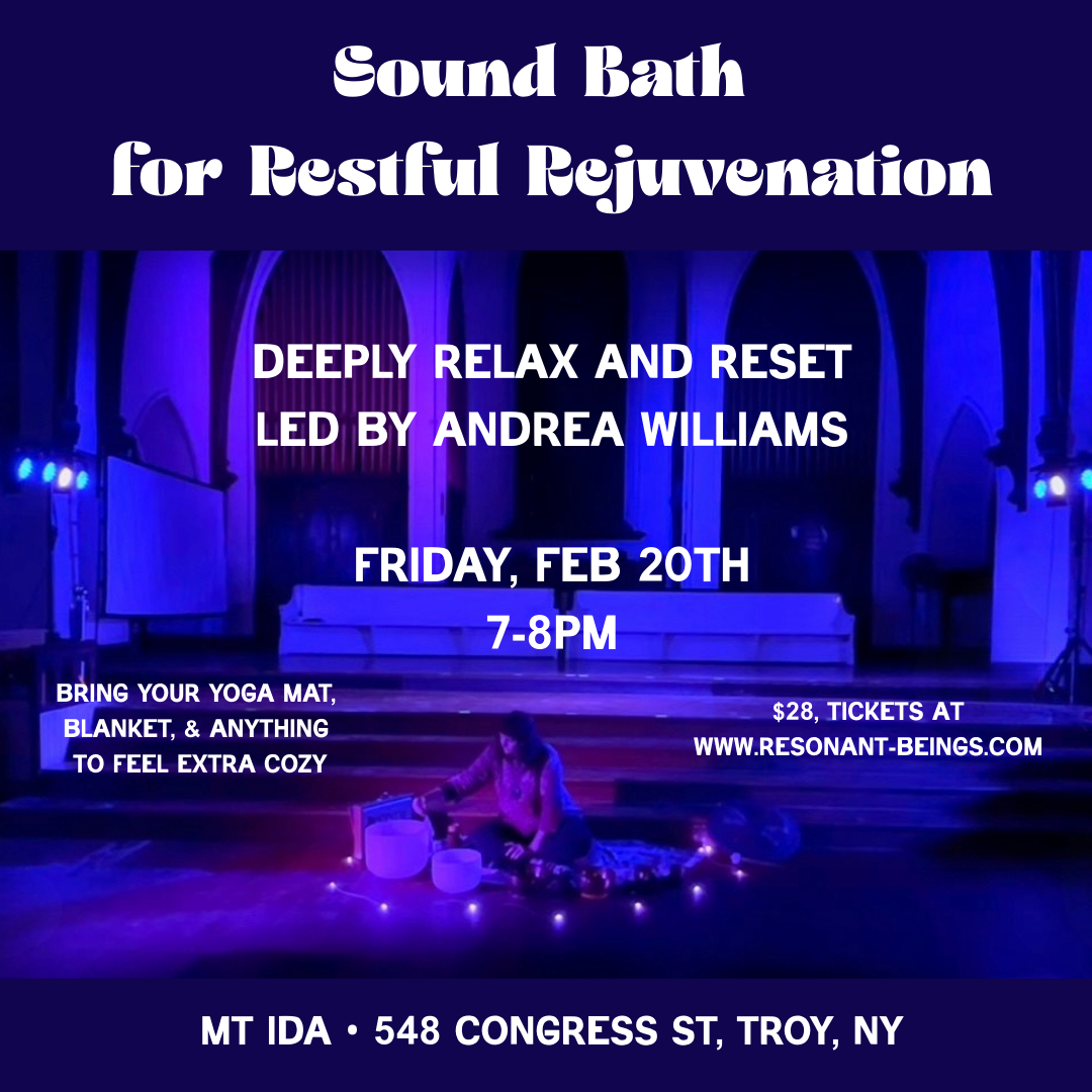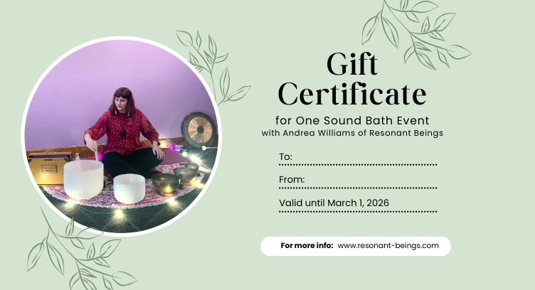 Sound Bath Event: Write Andrea at andrea@resonant-beings.com to request to RSVP for your preference of any of the sound baths taking place before March 1, 2026 with your gift certificate. (Events are listed below) Give the date of the sound bath and your full name. If there is a spot still available, you are covered! You will receive a confirmation email that will be your ticket for the event. You can print it out or just show via phone at the door.